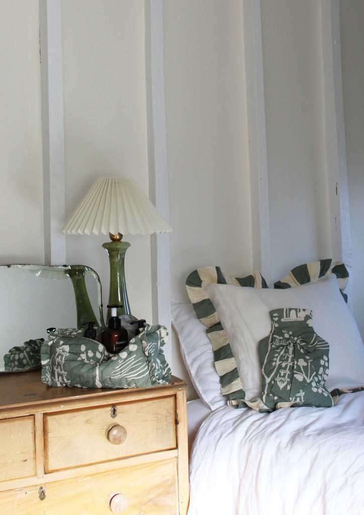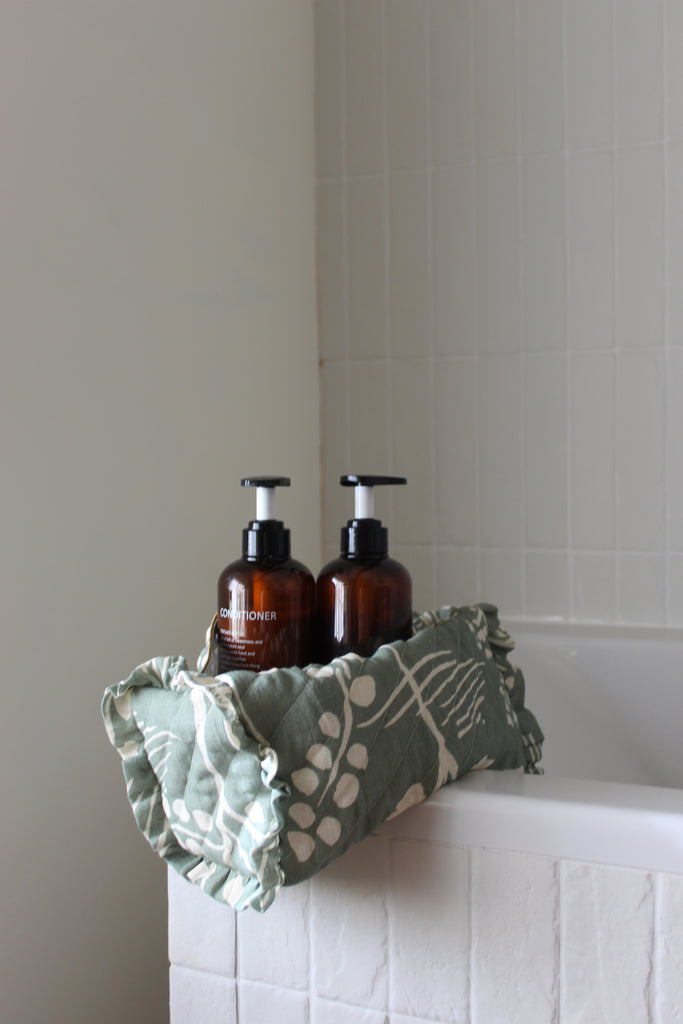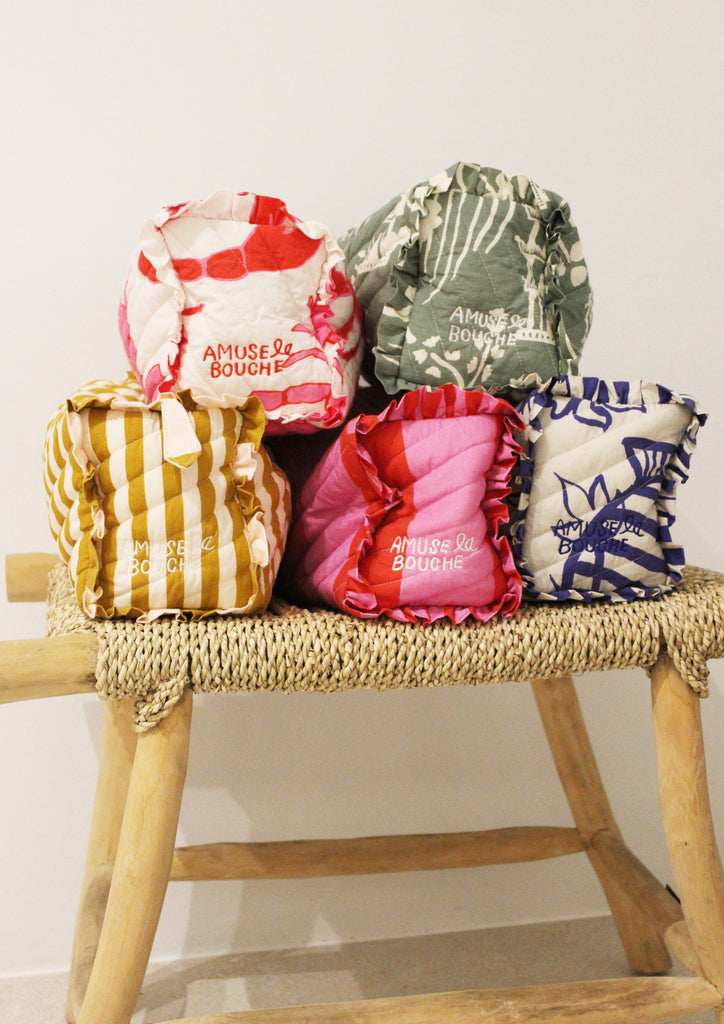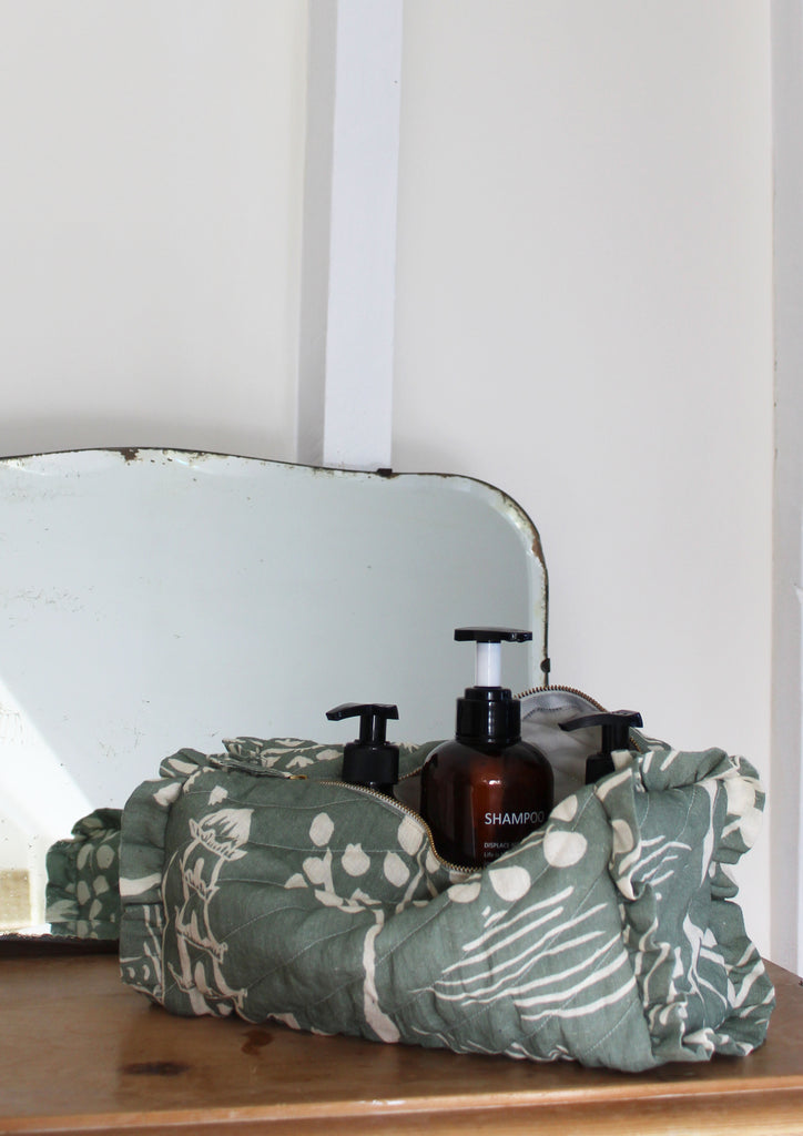 This makeup bag is made from 100% cotton and printed with eco-friendly dyes. Measuring 29 x 15 x 13 cm, it offers a perfect balance of style and practicality.