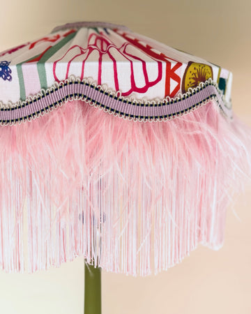 Made with Amuse la Bouche 100% finest European linen digitally printed with eco-friendly dyes derived from flax seed. Trimmed with hand dyed fringing, baby pink luxury ostrich feathers and finished with Elizabeth Ashdown passementerie. Fully lined in white 100% linen.